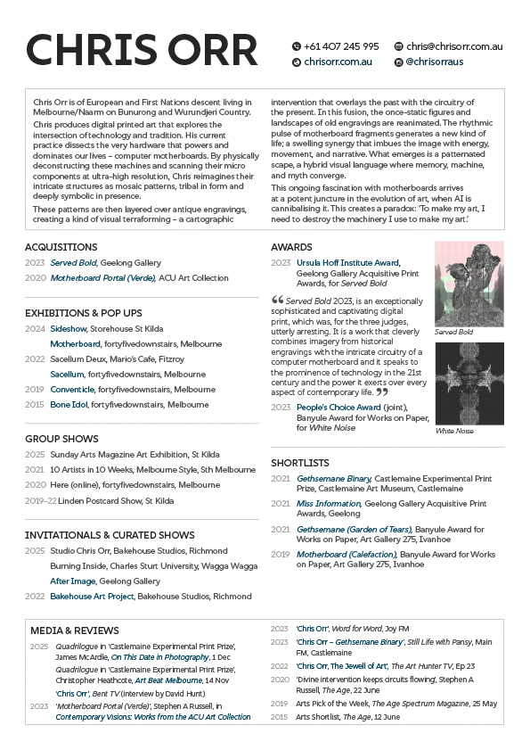 Chris’s work Quadrilogue was shortlisted in the Castlemaine Experimental Print Prize 2025, a reviewed favourably by Christopher Heathcote and James McArdle.